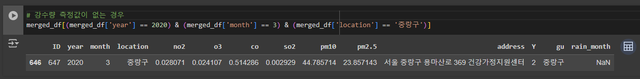 예를 들어 2023년 3월 중랑구에 강수량이 NaN값으로 나온다.
