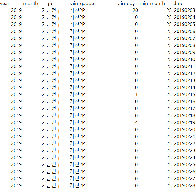 df_dailyrain = df_dailyrain.groupby(['gu', 'year', 'month'])['rain_month'].max().reset_index() # 월별 데이터로 변환