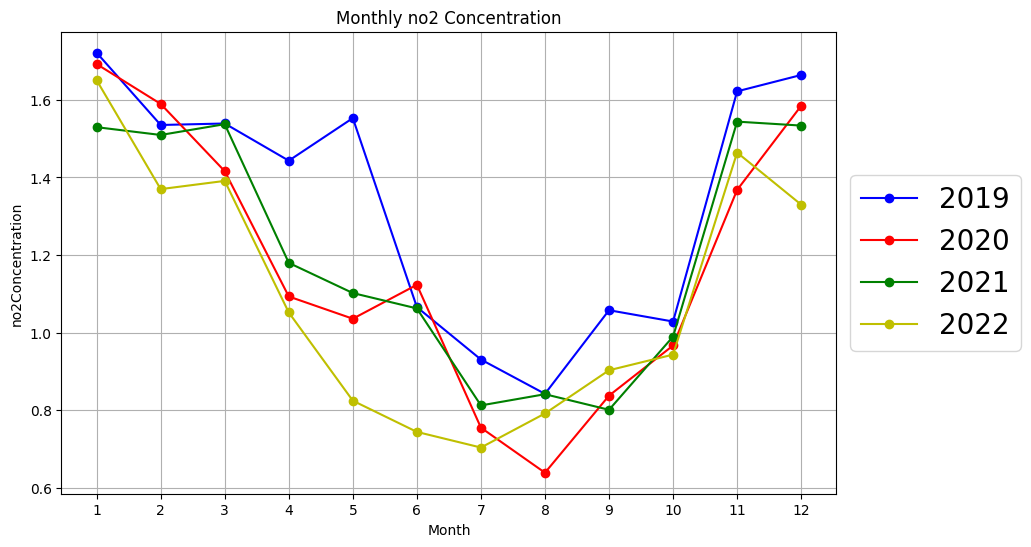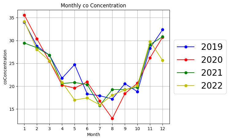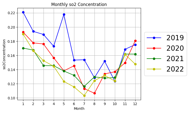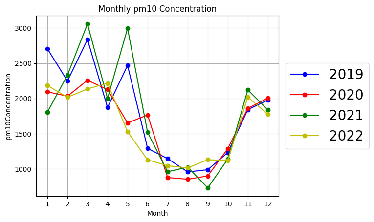 [대기오염 예측모델 개발] 월별 대기오염물질 농도 꺾은선 그래프 그리기 본문