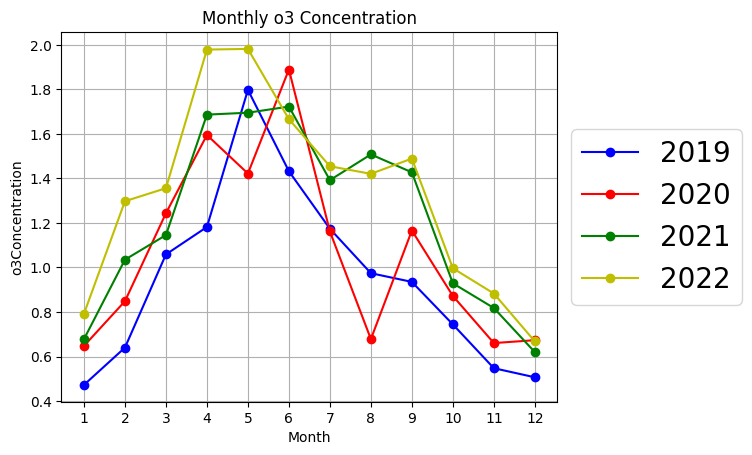 오존은 햇빛이 강하고 온도가 높은 여름에 농도가 올라간다. 4개년 모두 5, 6월에 집중적으로 o3가 높은 양상을 보인다.