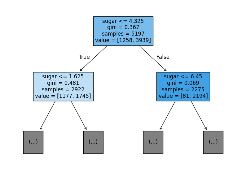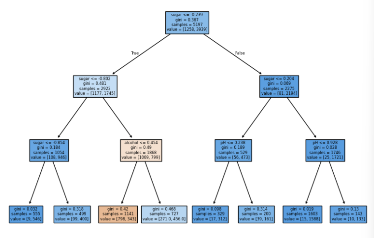 결과적으로 리프 노드에서 가장 많은 클래스가 예측 클래스가 된다. 왼쪽 자식 노드의 경우 value = [1177, 1745]이므로 양성 클래스인 화이트 와인으로 예측한다. 오른쪽 자식 노드의 경우 value = [81, 2194]이므로 양성 클래스인 화이트 와인으로 예측한다.