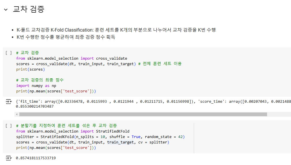 훈련 세트를 k개의 부분으로 나눠서 교차 검증을 수행하는 것을 K-폴드 교차 검증이라고 한다.