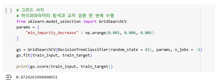 사이킷런에서 제공하는 GridSearchCV 클래스를 이용하면 하이퍼파라미터 탐색과 교차 검증을 한 번에 수행할 수 있다.
