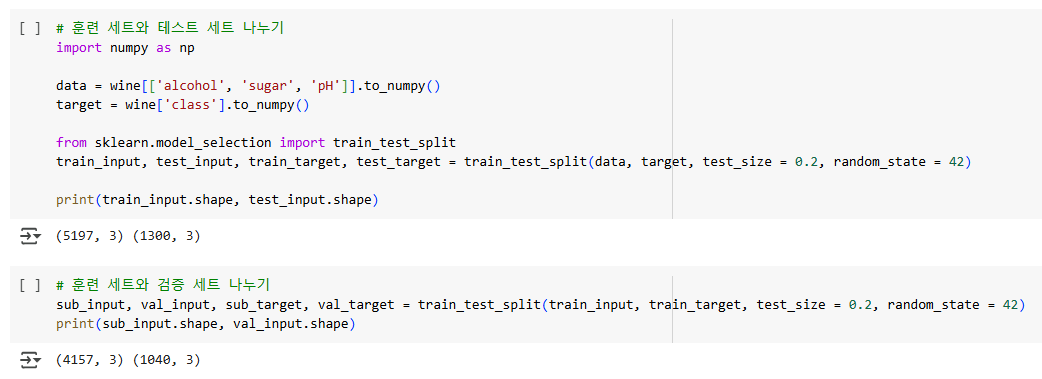 검증 세트가 추가되는 경우 훈련 세트는 train_input 대신 sub_input으로 명시해준다. 헷갈리지 않게 이 규칙을 계속 지키면 좋을 것 같다.