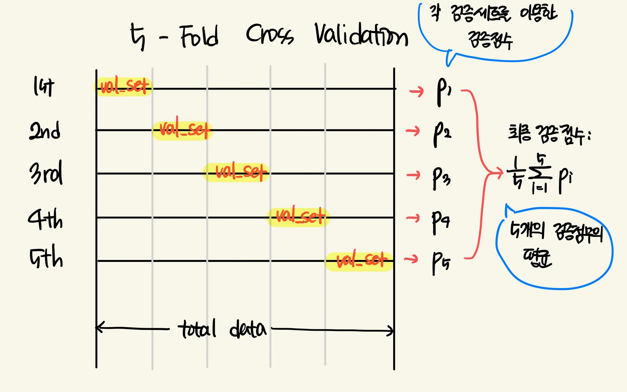 이 문제를 해결하고자 검증 세트를 떼어 내어 평가하는 과정을 여러 번 반복하는 교차 검증(Cross Validation) 개념이 도입되었다.
