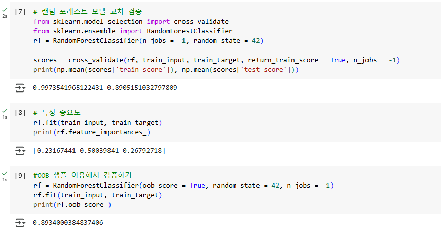 부트스트랩 샘플을 이용하면 자연스럽게 OOB(Out of bag) 샘플이 생긴다. 이건 복원추출을 하다보니 샘플에 포함되지 않고 남는 샘플을 뜻한다. 이 남는 샘플을 검증 세트로 이용해서 검증 점수를 파악할 수 있다.