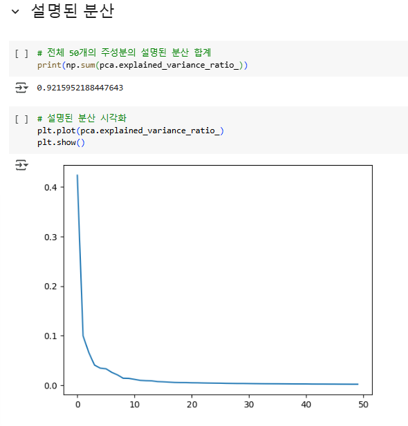 처음 10개의 주성분이 대부분의 분산을 표현하고 있음을 알 수 있다. 주성분 분석은 로지스틱 회귀, k-평균 알고리즘 등 다른 알고리즘과 함께 사용될 수 있다.