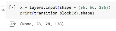 전환 블록은 특성 맵의 너비, 높이, 채널을 줄여줍니다. 전환 블록은 총 4개의 층으로 이루어져 있습니다.