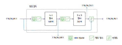 - 합성곱층: 1 x 1 크기의 필터를 사용, 필터의 크기는 입력 채널의 절반
