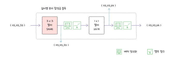위에 나온 방법대로 깊이별 분리 합성곱 블록을 만들면 특성 맵의 크기가 계속 줄어들지 않고, 차원의 개수만 지정 가능합니다. 특성 맵의 크기가 줄어들지 않으면 신경망의 깊이가 깊어질수록 더 복잡한 연산을 수행하느라 리소스가 크다는 단점이 있습니다.