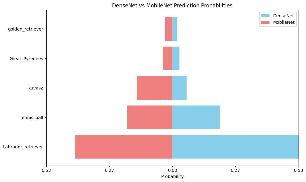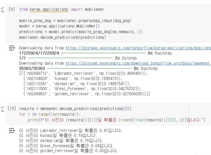위와 같이 시각화하여 DenseNet과 MobileNet 모두 비슷한 확률로 예측하고 있음을 알 수 있습니다. Labrador retriever로 예측하는 확률이 MobileNet이 좀 더 작긴 하지만, 용량의 크기가 5배 차이남을 감안하면 MobileNet이 꽤 효율적인 모델임을 알 수 있습니다.