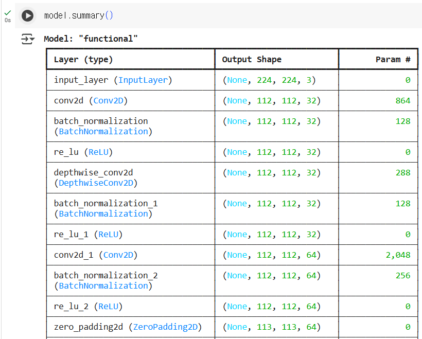 | 합성곱층 | Conv2D() | 필터 개수 = 32, 커널 크기 = 3, 스트라이드 = 2, 편향 사용 X, 세임 패딩 | (112, 112, 32) |
