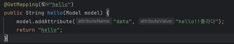 예를 들어 이 hello 메서드에서는 리턴자료형이 String이고, "hello"라는 문자열을 반환한다.
