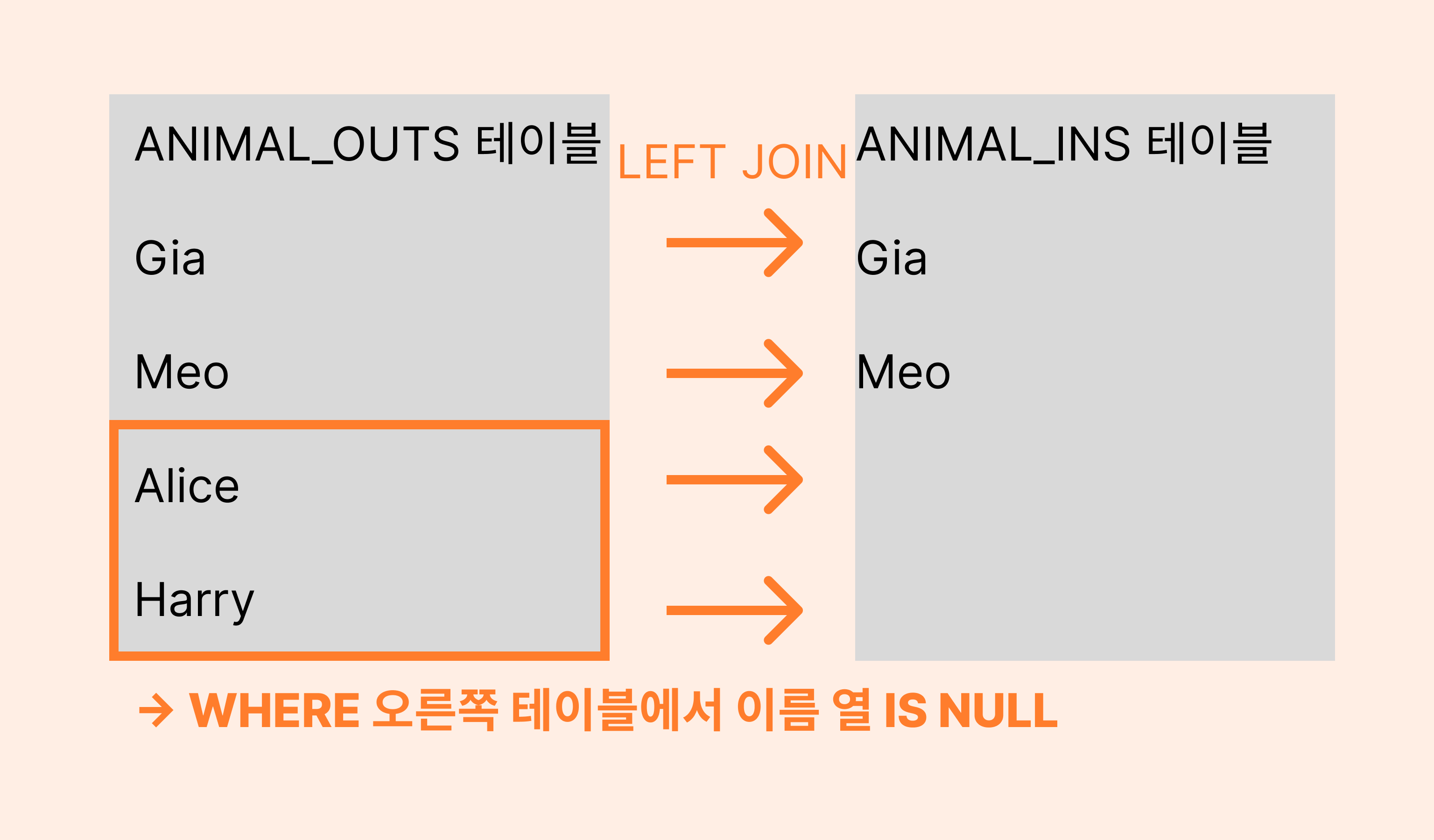 1. ANIMAL_OUTS에 있지만 ANIMAL_INS에는 없는(LEFT JOIN, WHERE)